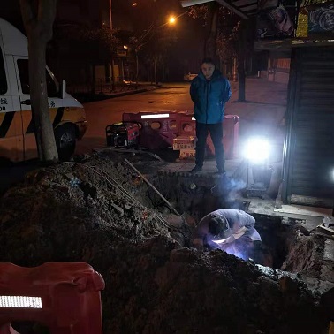 2月2日晚8点40分,接到市民报漏电话,位于晏家湾车站外的供水主管爆裂,部门立即组织人员赶往现场。经查看确认为一根DN150供水主管破裂,为了保障居民的正常用水,抢修人员连夜冒雨对供水管道进行抢修,经过5个小时的抢险作业,于次日凌晨1点完成抢修任务,保障了该区域居民正常用水。