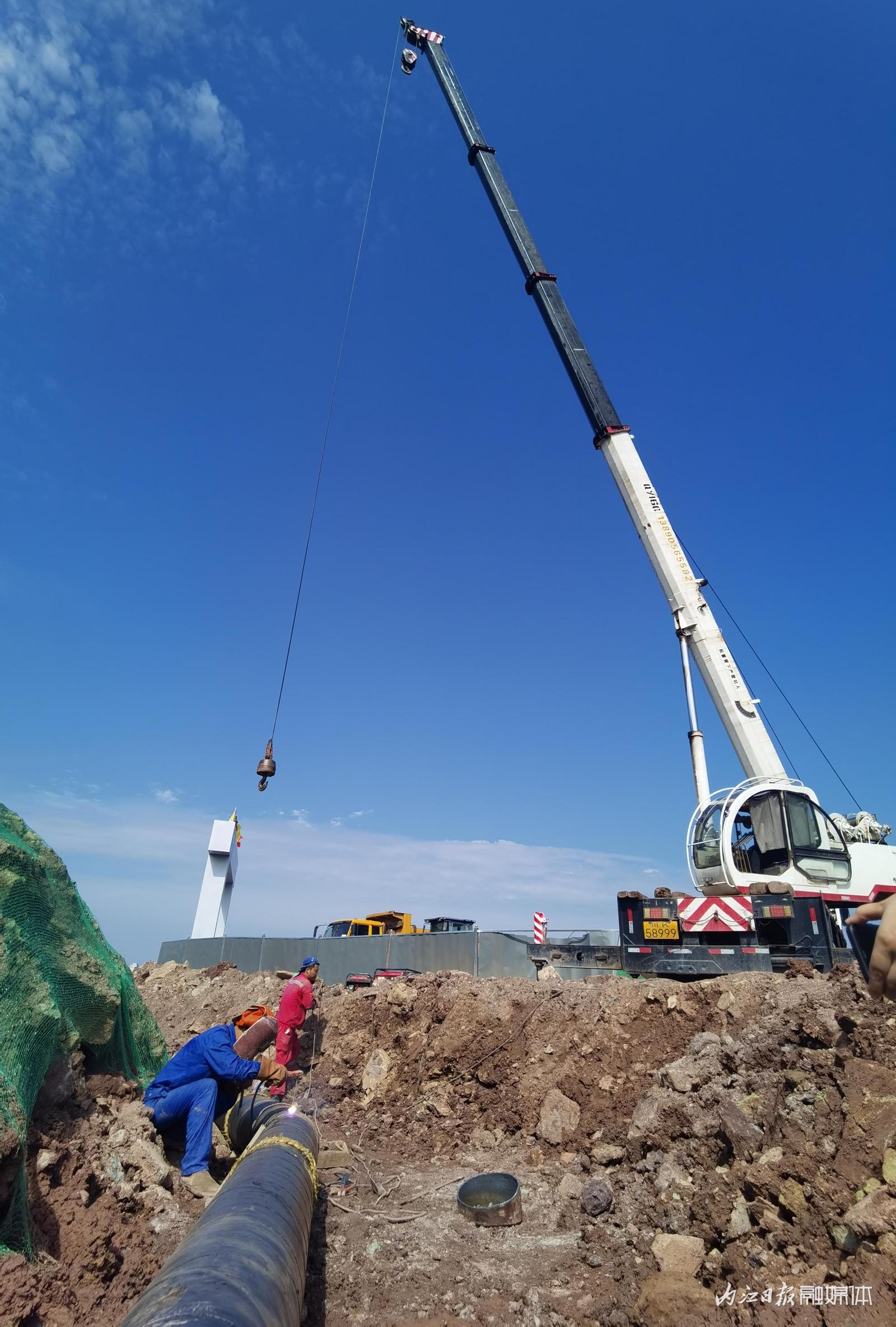 现场,机械声轰鸣,大型挖掘机正在马路边开沟挖槽,大型吊车将管道吊到挖好的沟槽内,由施工人员逐节进行焊接……分工明确,专业有序,白晃晃的阳光下,工人们挥汗如雨,衣服早已湿透。