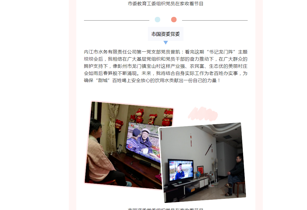 六个党支部高度重视、立即行动,在周六晚上7:50准时组织党员收看节目,并在内江水务党务微信群里把收看照片和观后感进行分享,大家积极踊跃,学习气氛热烈。