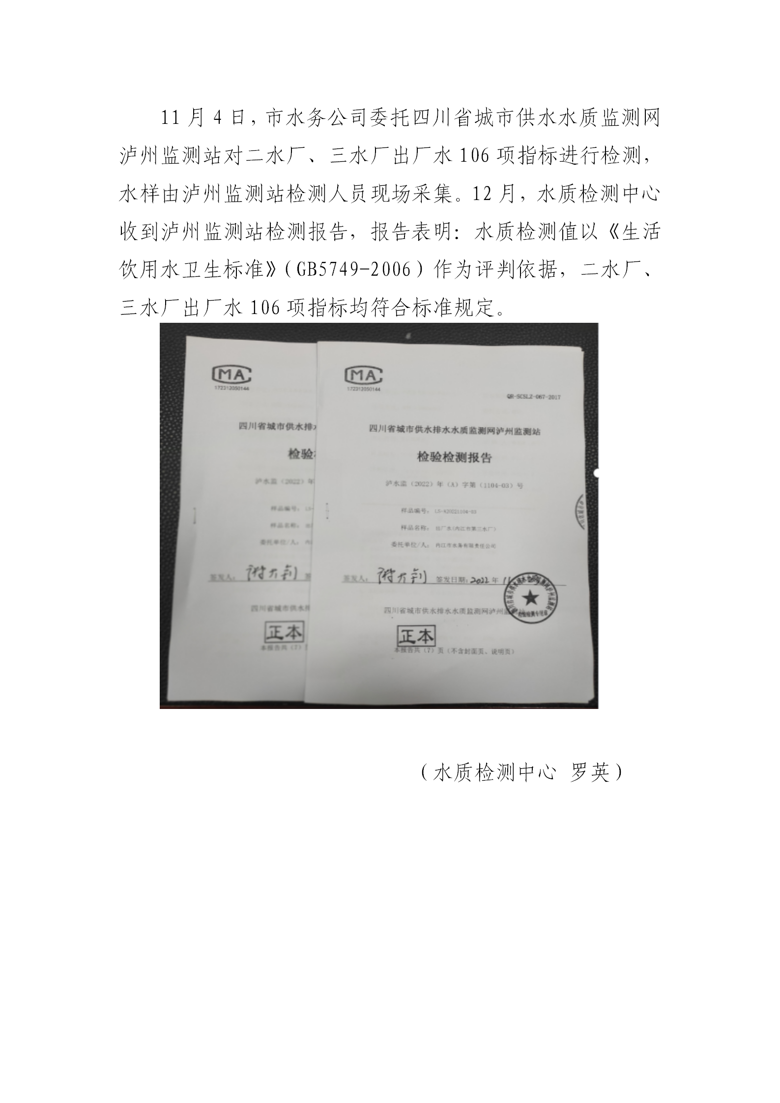 二水厂、三水厂出厂水106项指标 符合国家标准要求