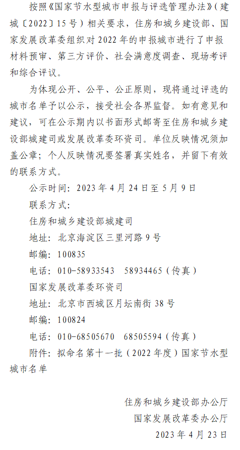 关于拟命名第十一批(2022年度) 国家节水型城市的公示