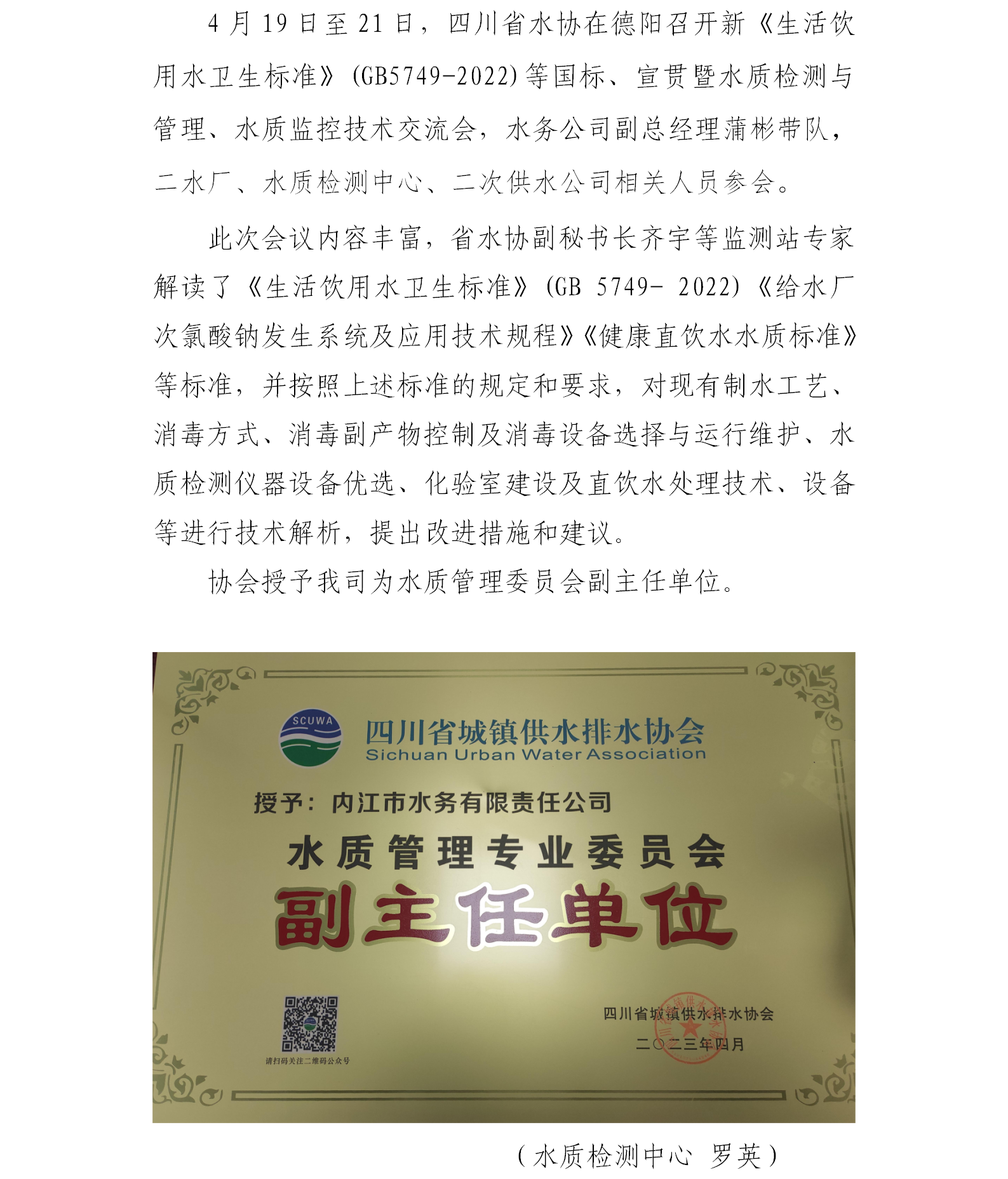 内江皇冠体育博彩 获省水协授予水质管理专业委员会副主任单位