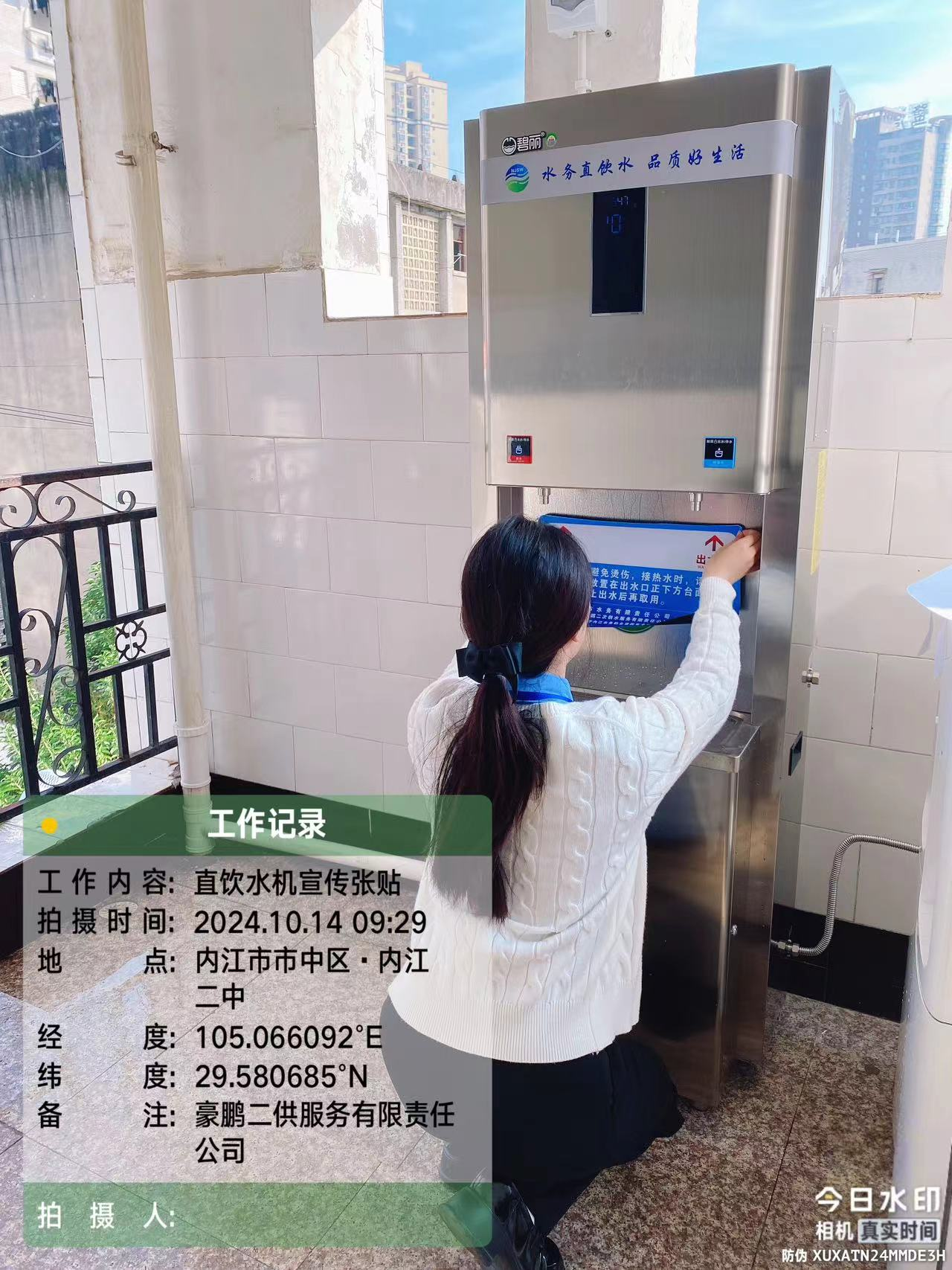 近期,内江二中(沱中路校区) 21 台直饮水设备顺利完成了安装,豪鹏公司积极跟进完善配套服务,在直饮水设备上张贴了运维记录表及温馨提示。