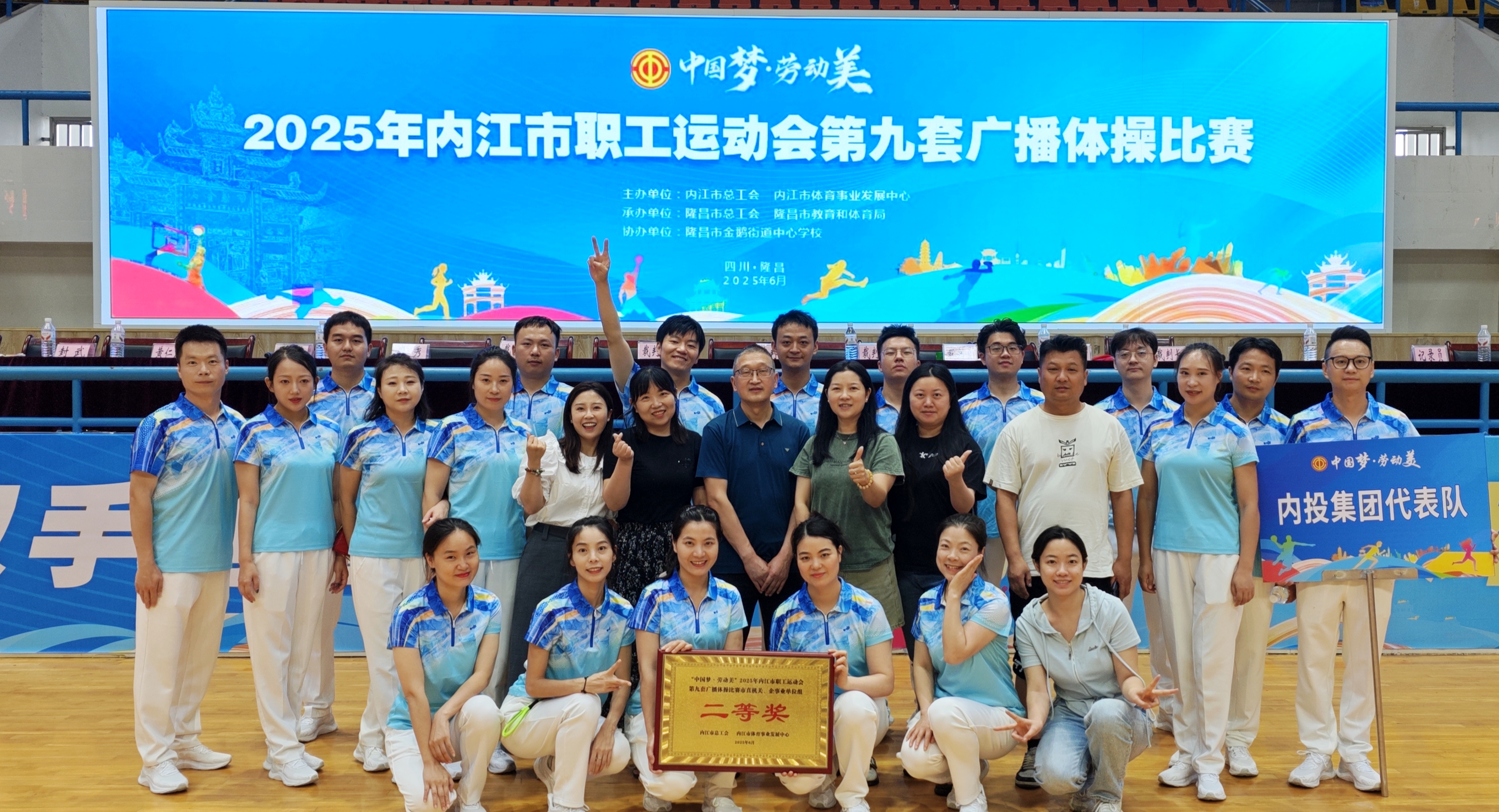 6月21日,2025年内江市职工运动会第九套广播体操比赛在隆昌市体育中心成功举办。由皇冠体育博彩 和云智科技公司联合组成的内投集团公司代表队凭借优异表现,荣获市直机关、企事业单位组第二名,喜获二等奖。
