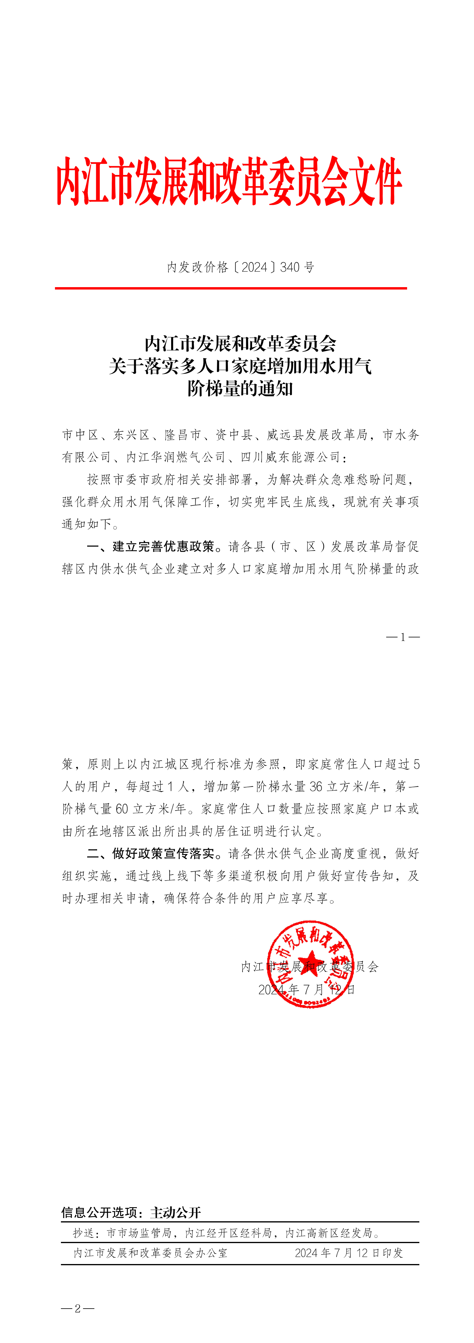 内江市发展和改革委员会关于落实多人口家庭增加用水用气阶梯量的通知