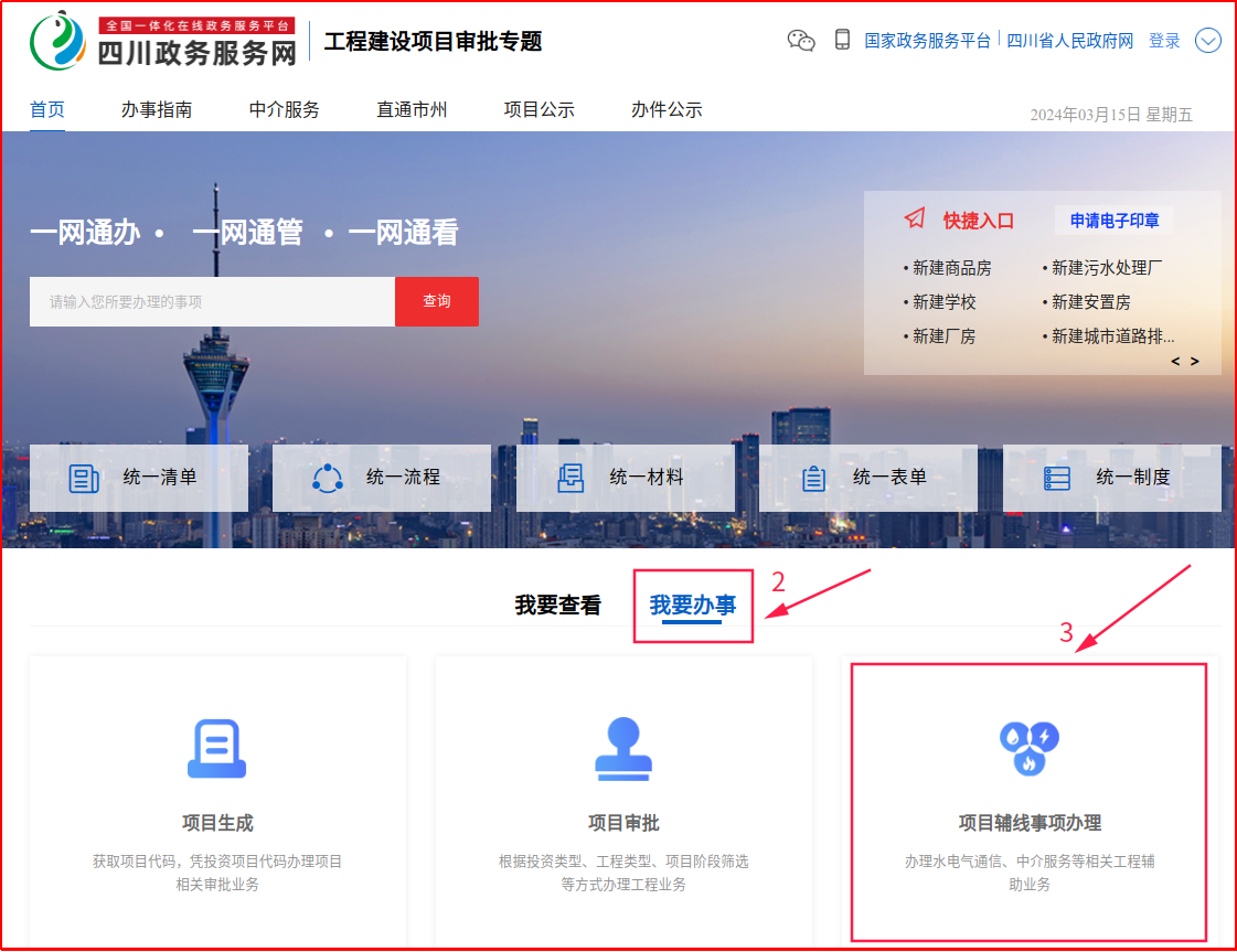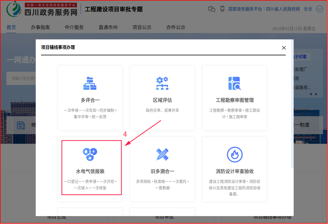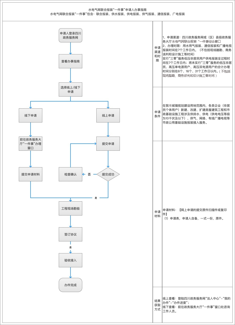 (一)网上申请:申请人登录四川政务服务网平台,点击工程建设项目审批专栏,选择具体报装办理事项,提交申请,上传申请材料。